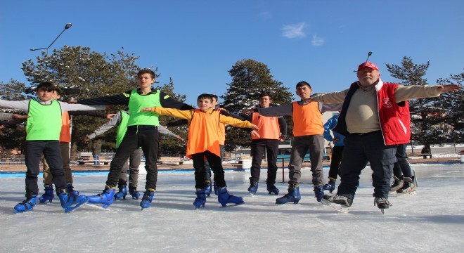 Aralık ayının başlarında dondurulan süs havuzunda gerekli önlemler alınarak yerli ve yabancı öğrencilere Büyükşehir Belediyesi tarafından verilen ekipmanlar sayesinde buz pateni öğretiliyor.
