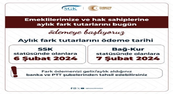 Bu çerçevede SSK ve BAĞ-KUR emeklilerine yapılan zamların farkları dün ödenmeye başladı. SSK emeklilerine yapılan zammın farkı 6 Şubat, Bağ-Kur emeklilerine yapılan zammın farkı ise 7 Şubat hesaplara yatacak.