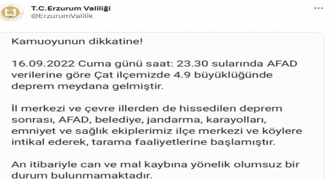Erzurum Valiliği Çat ilçesinde yaşanan deprem ile gili olarak bir açıklama yaptı, Açıklamada, ‘16 Eylül Cuma günü saat 23.30 sularında AFAD verilerine göre Çat İlçemizde 4.9 büyüklüğünde deprem meydana gelmiştir. İl merkezi ve çevre illerden de hissedilen deprem sonrası, AFAD, belediye, jandarma, karayolları, emniyet ve sağlık ekiplerimiz ilçe merkezi ve köylere intikal ederek tarama faaliyetlerine başlamıştır. An itibarıyla can ve mal kaybına yönelik olumsuz bir durum bulunmamaktadır.’ İfadelerine yer verildi.